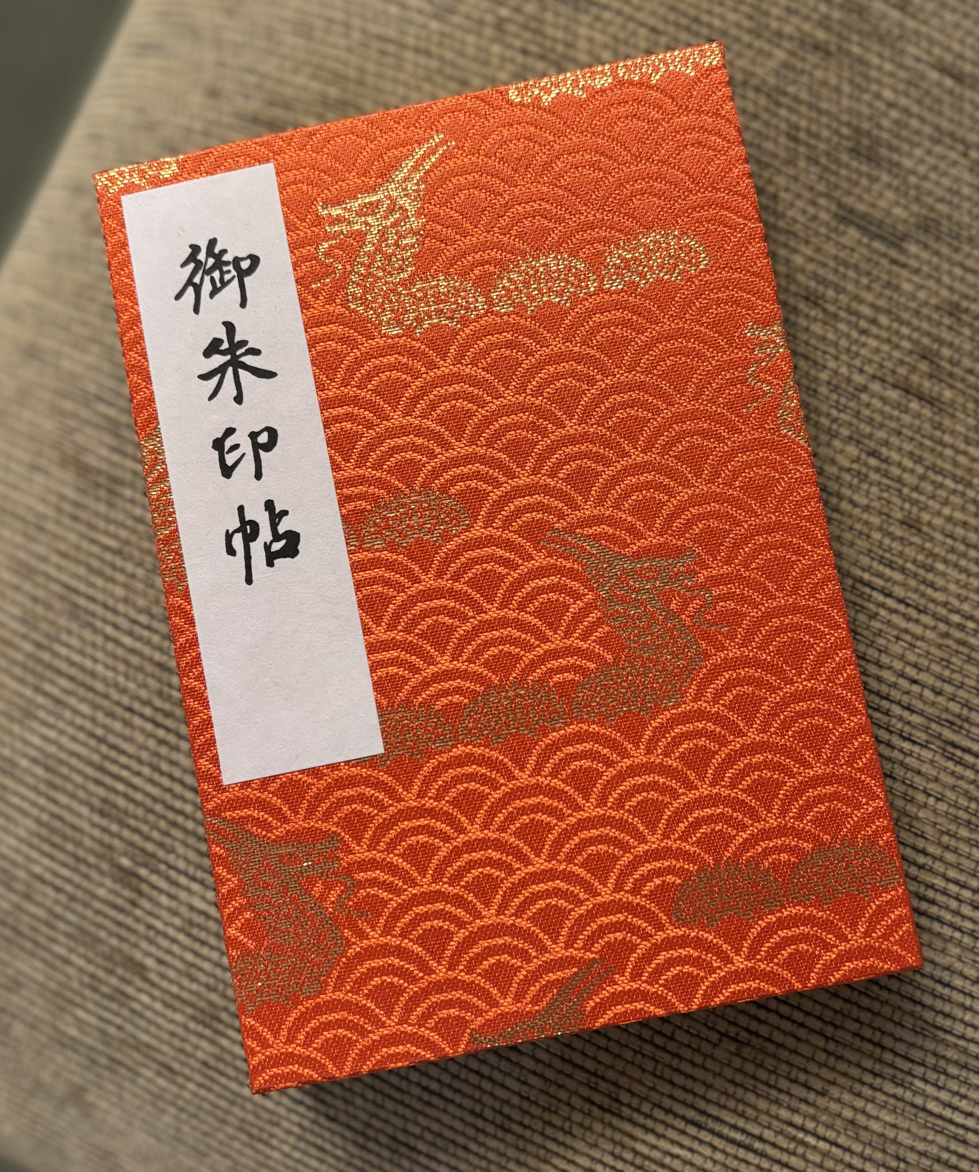 I’d done research beforehand and knew I needed a goshuincho (stamp book). Luckily, next to the service counter, there were goshuincho in different sizes and a variety of colors lined up on a shelf. I picked the one that I knew would fit in my backpack and be easy to carry around. It had an orange cover with sparkly golden dragons and cost 2,500 Yen (approximately $17).